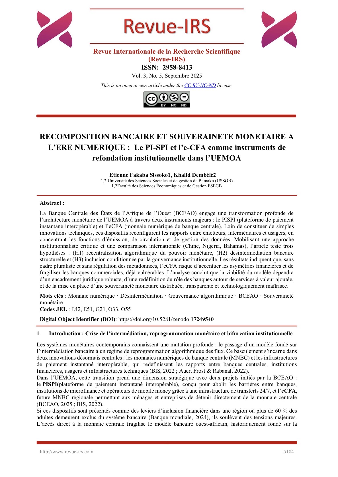 La Banque Centrale des États de l’Afrique de l’Ouest (BCEAO) engage une transformation profonde de l’architecture monétaire de l’UEMOA à travers deux instruments majeurs : le PISPI (plateforme de paiement instantané interopérable) et l’eCFA (monnaie numérique de banque centrale). Loin de constituer de simples innovations techniques, ces dispositifs reconfigurent les rapports entre émetteurs, intermédiaires et usagers, en concentrant les fonctions d’émission, de circulation et de gestion des données. Mobilisant une approche institutionnaliste critique et une comparaison internationale (Chine, Nigeria, Bahamas), l’article teste trois hypothèses : (H1) recentralisation algorithmique du pouvoir monétaire, (H2) désintermédiation bancaire structurelle et (H3) inclusion conditionnée par la gouvernance institutionnelle. Les résultats indiquent que, sans cadre pluraliste et sans régulation des métadonnées, l’eCFA risque d’accentuer les asymétries financières et de fragiliser les banques commerciales, déjà vulnérables. L’analyse conclut que la viabilité du modèle dépendra d’un encadrement juridique robuste, d’une redéfinition du rôle des banques autour de services à valeur ajoutée, et de la mise en place d’une souveraineté monétaire distribuée, transparente et technologiquement maîtrisée.