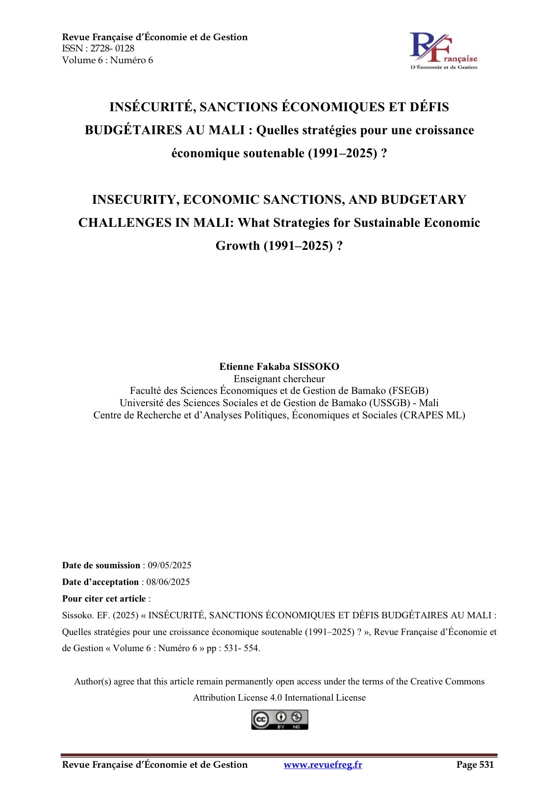 Cet article analyse l’impact combiné de l’insécurité persistante et des sanctions économiques de la CEDEAO sur la soutenabilité budgétaire et la croissance économique du Mali entre 1991 et 2025. À partir d’une approche mixte associant un modèle ARDL et quarante entretiens semi-directifs, il met en lumière que les dépenses publiques productives et l’investissement dans le capital humain stimulent la croissance, tandis que les dépenses courantes financées par la dette, les sanctions régionales et l’insécurité en freinent durablement le rythme. L’étude plaide pour une réallocation stratégique des ressources vers des postes productifs, une gestion sélective de la dette, et une diversification des partenariats au-delà de la CEDEAO. Elle souligne l’urgence de concilier impératifs sécuritaires et investissements de long terme pour garantir une croissance soutenable, et fournit des recommandations utiles aux décideurs en contexte sahélien.